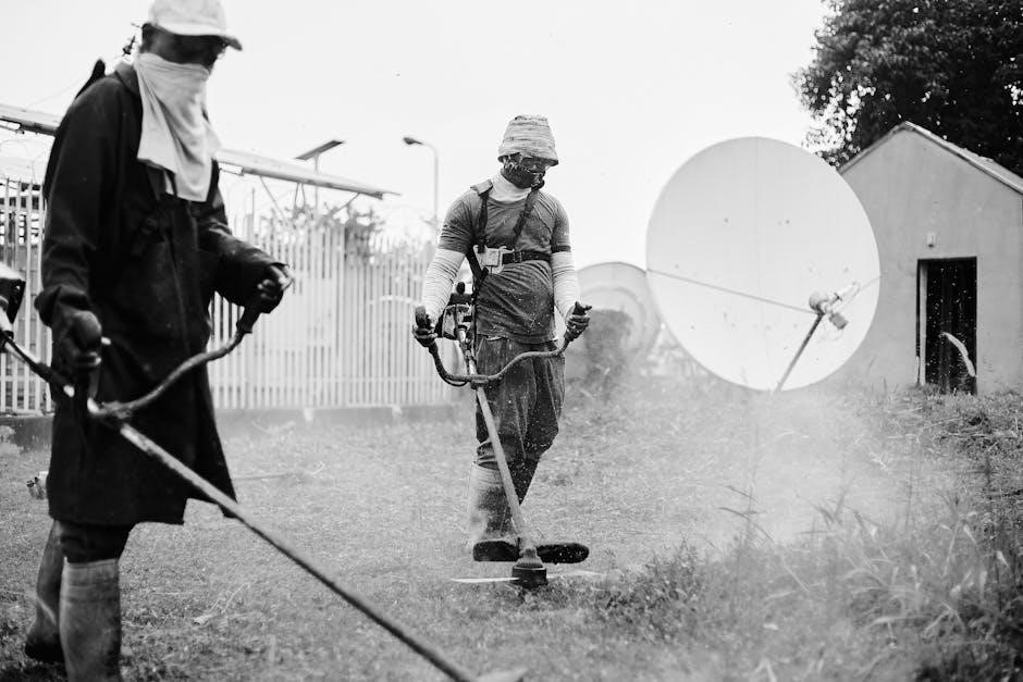 Ensure all safety shields and guards are securely in place. Wear appropriate safety glasses and sturdy footwear. Be mindful of slopes and uneven terrain‚ avoiding steep inclines.